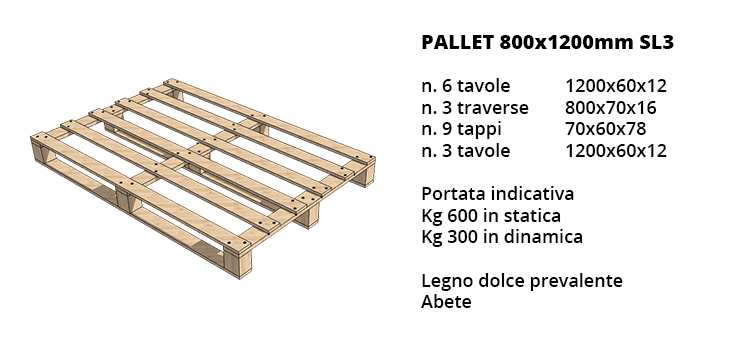 Pallets Bertolin s.r.l. annovera che tra i propri prodotti i pallets di misure standard (da 80×120 cm a 100x120cm) di varia portata in base all’esigenza del cliente. Nella galleria si possono trovare i vari tipi di pallets standard con le misure e le portate.